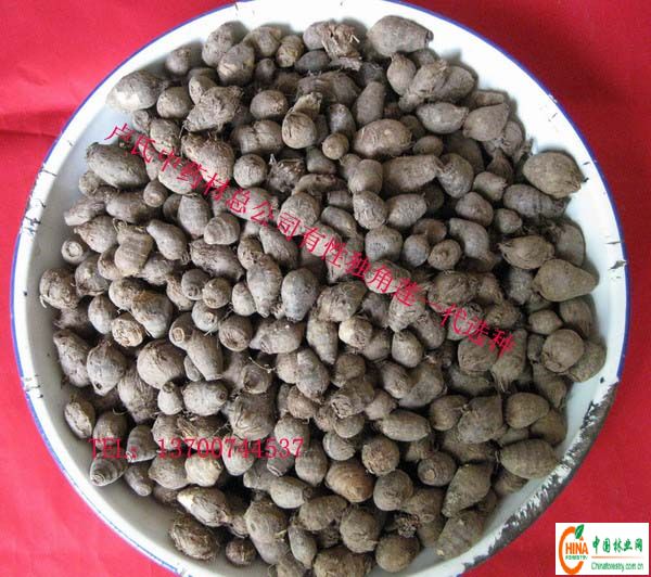 独角莲,药性辛.温.有毒,燥湿利水.排毒之功效。 生长习性:喜温和湿润气侯,能耐寒、耐阴蔽.耐干旱,可与林果庄稼作物间作,沙质土均可种植。栽培技术:选地整地.深翻.耙细,每亩施杂肥2000公斤,并加入复合肥15—20公斤,撒于地面,耕耙整平。 繁殖方法:块茎繁殖,在平整好的土地上按行距35公分,株距25公分,将直径3厘米左右的小块茎放入5厘米的沟内盖平即可,适合全国各地发展种植。当年种植,当年即可收获。 效益分析:亩产鲜品1200公斤,干品300——500公斤,现市场价18——20元,每亩产值6500。 采收加工:可在当年10月间采挖收取块茎3厘米以上,做为商品除去外皮,清水冲洗后,装筐架起距地面20公分,用塑料布包严后用硫黄点燃熏60分钟取出放于席上或水泥地平上晒干,并及时翻动,3厘米以下块茎用沙土混拌贮藏,做为来年种植使用。