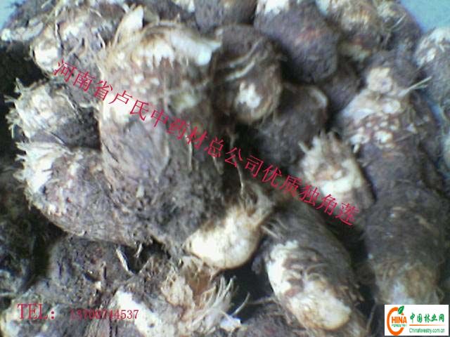 独角莲,药性辛.温.有毒,燥湿利水.排毒之功效。 生长习性:喜温和湿润气侯,能耐寒、耐阴蔽.耐干旱,可与林果庄稼作物间作,沙质土均可种植。栽培技术:选地整地.深翻.耙细,每亩施杂肥2000公斤,并加入复合肥15—20公斤,撒于地面,耕耙整平。 繁殖方法:块茎繁殖,在平整好的土地上按行距35公分,株距25公分,将直径3厘米左右的小块茎放入5厘米的沟内盖平即可,适合全国各地发展种植。当年种植,当年即可收获。 效益分析:亩产鲜品1200公斤,干品300——500公斤,现市场价18——20元,每亩产值6500。 采收加工:可在当年10月间采挖收取块茎3厘米以上,做为商品除去外皮,清水冲洗后,装筐架起距地面20公分,用塑料布包严后用硫黄点燃熏60分钟取出放于席上或水泥地平上晒干,并及时翻动,3厘米以下块茎用沙土混拌贮藏,做为来年种植使用。